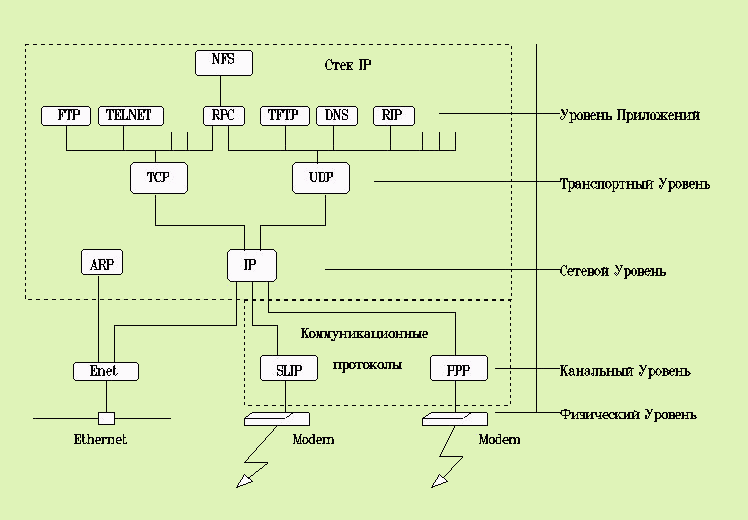 Схема приведена для случая подключения узла сети через локальную сеть Ethernet, поэтому названия блоков данных будут отражать эту специфику.